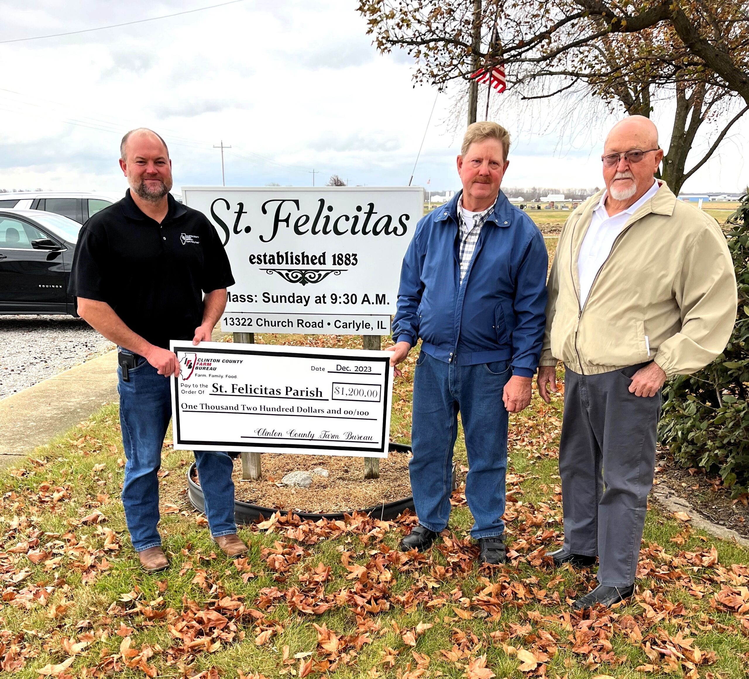 Clinton CFB Director Justin Benhoff presented St. Felicitas Parish Trustee Alan Heldorfer and parishioner Dan Ketterer with a $1,200 check for their 2023 “Community Impact Grant” for new signage at the parish cemetery and on the parish grounds.