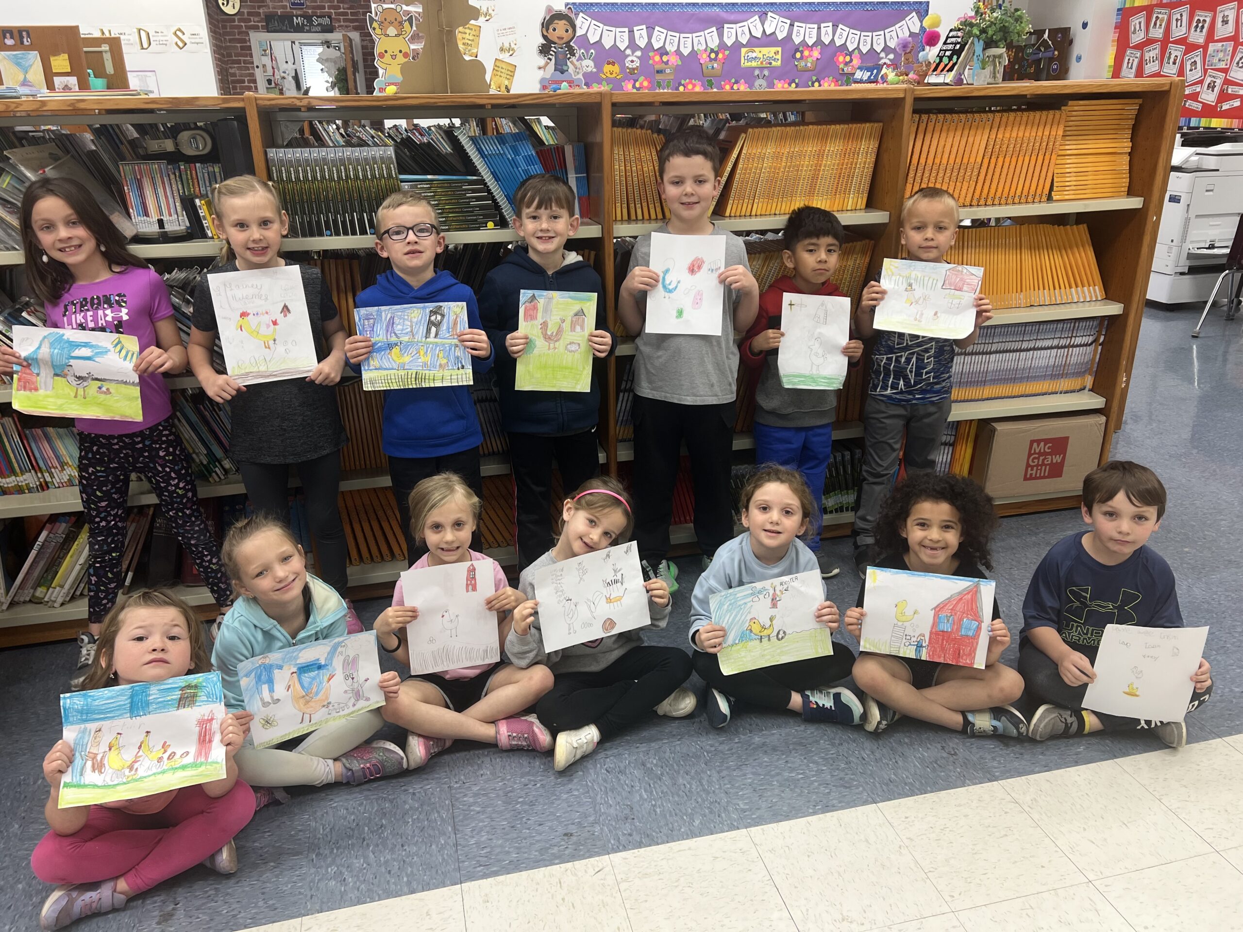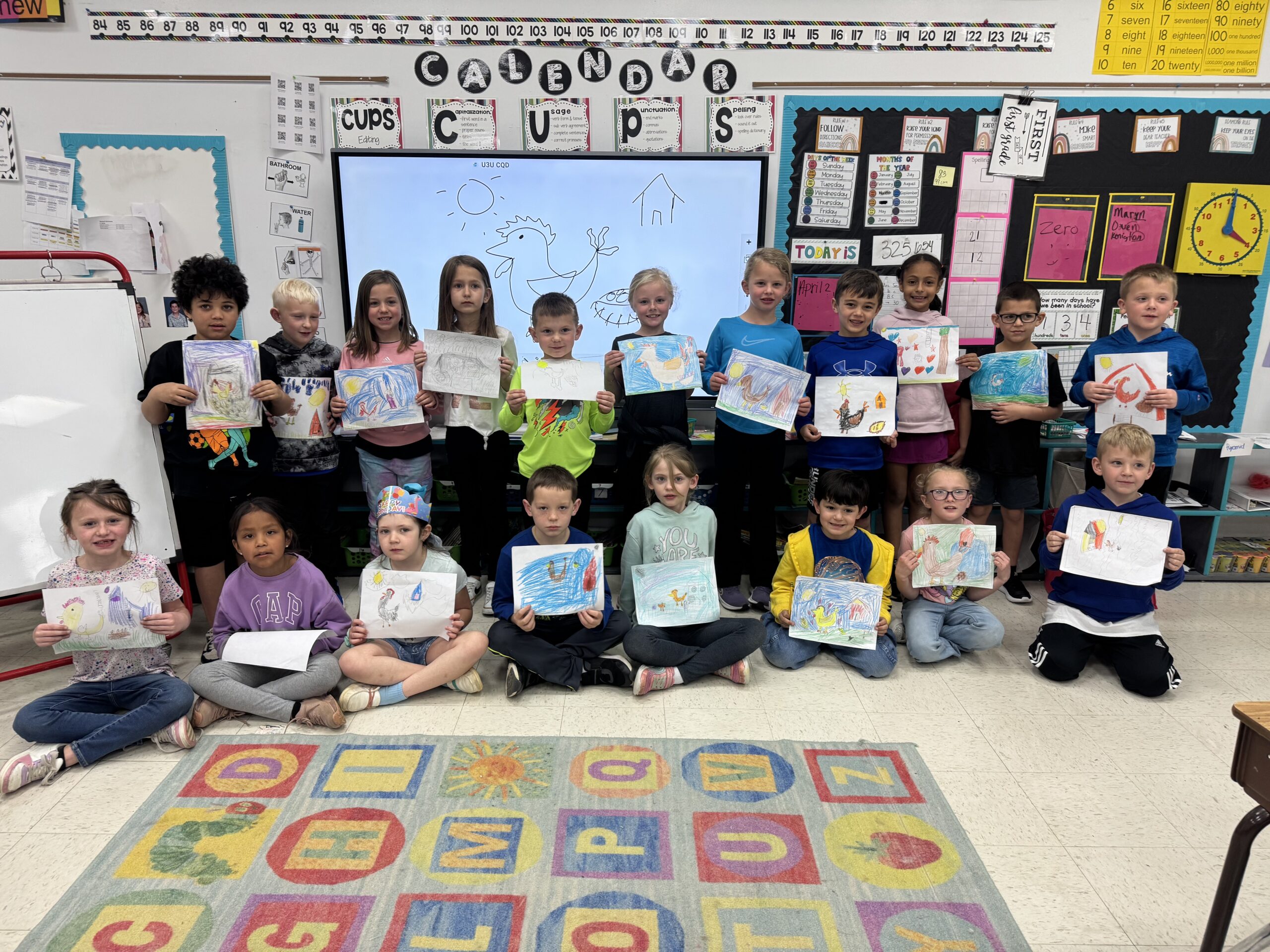 During the month of April, the first-grade students will be learning about all things Chicken. Mrs. Kleiboeker will be reading “Sonya’s Chickens” to the class and then the kids learn how to draw a chicken. During this lesson, the first graders learn about how the Comb and Waddle help to keep the chicken’s cool and the different food items that they eat. The book also discusses the circle of life and how chickens eat insects and worms and foxes eat chickens. The kids are enjoying learning about how interesting chickens can be.