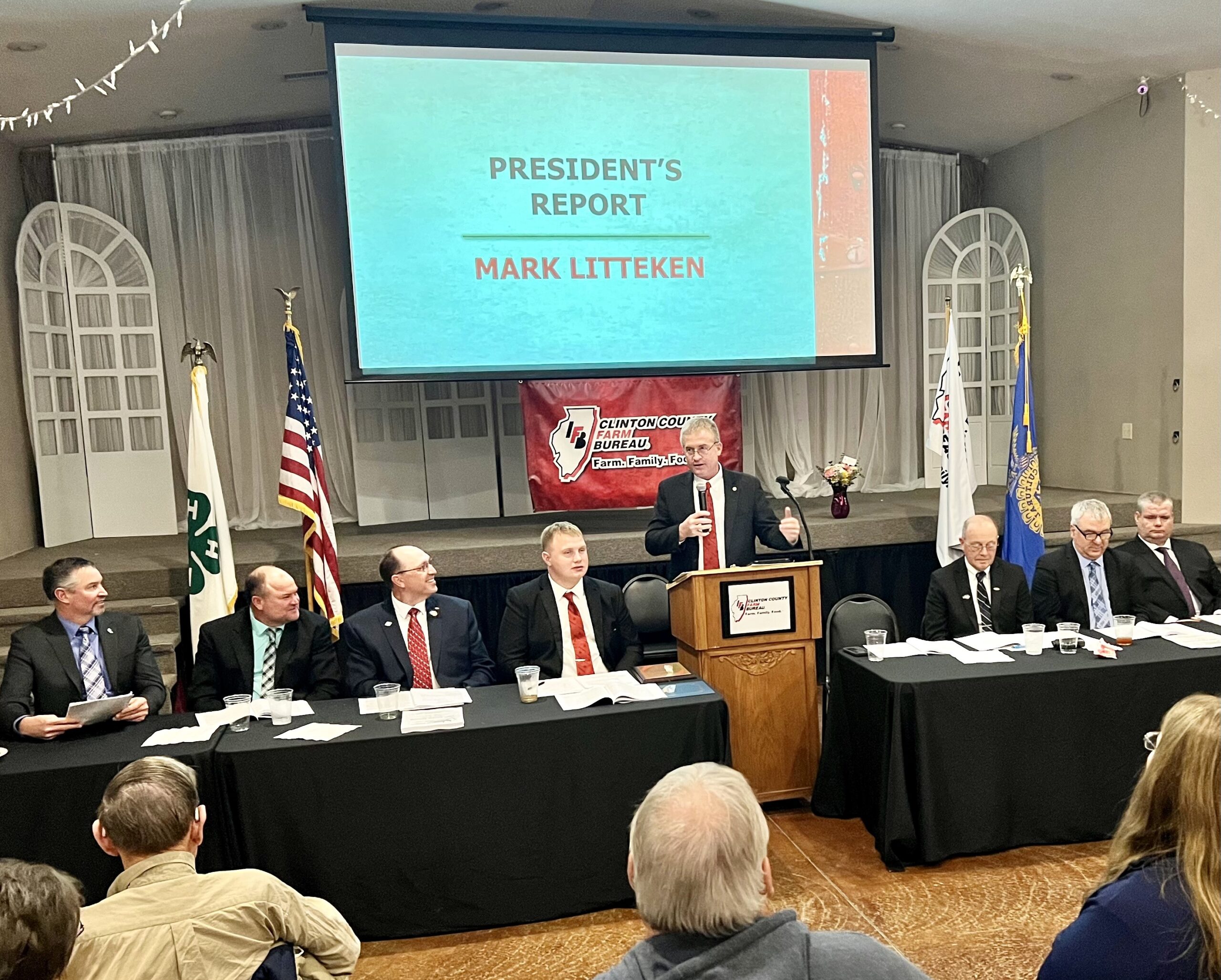 During his first President’s address, Mark Litteken recapped some of the past year’s programs, activities, and accomplishments, laid out some goals he had for the organization moving forward, and really challenged the membership with the importance of “telling their story” about agriculture. President Litteken also commented on cooperation with the Clinton County Board this past year to pass Resolutions in support of agriculture and opposition to foreign owned farmland in the county. President Litteken then invited County Board Chairman Brad Knolhoff to the podium to provide some remarks as well.