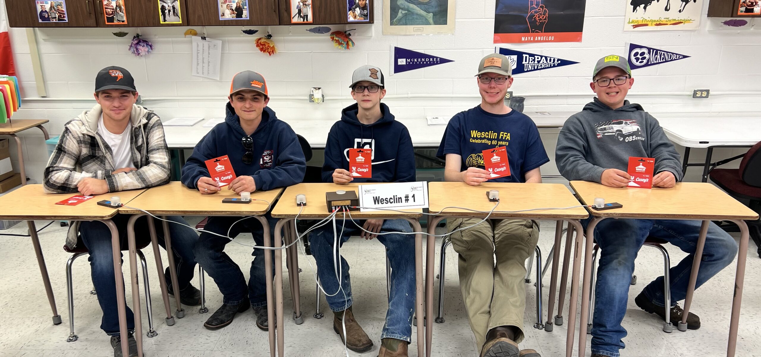 - Kade Radloff, Camren Ferri, Charlie Brunker, Tyler Horstmann, and Jacob Engelman from Wesclin FFA took 3rd place in the recent “FFA Quiz Bowl” sponsored by the Clinton CFB Young Leader Committee.